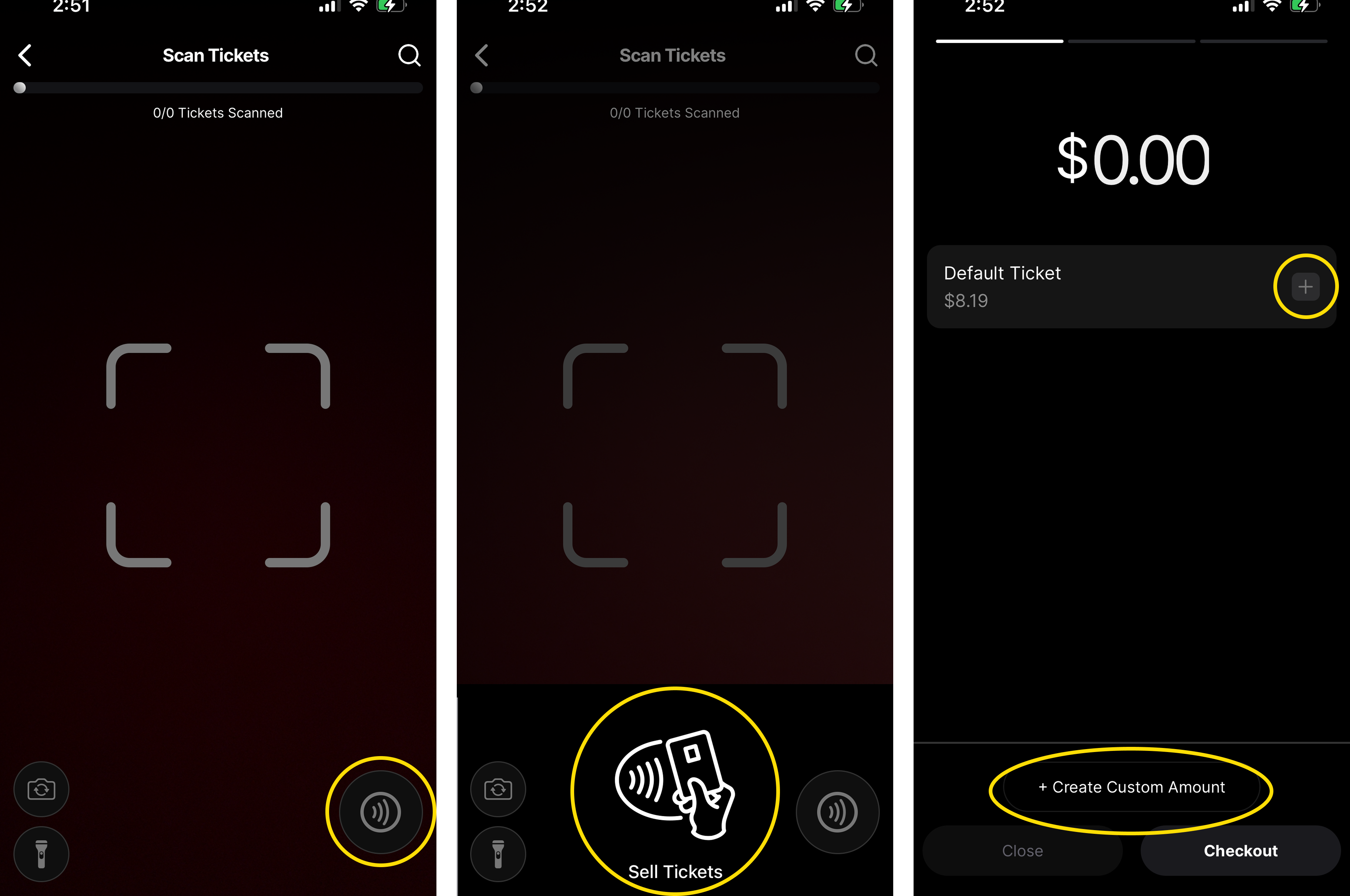 - Add the ticket you want to charge — or alternatively, create a custom amount.