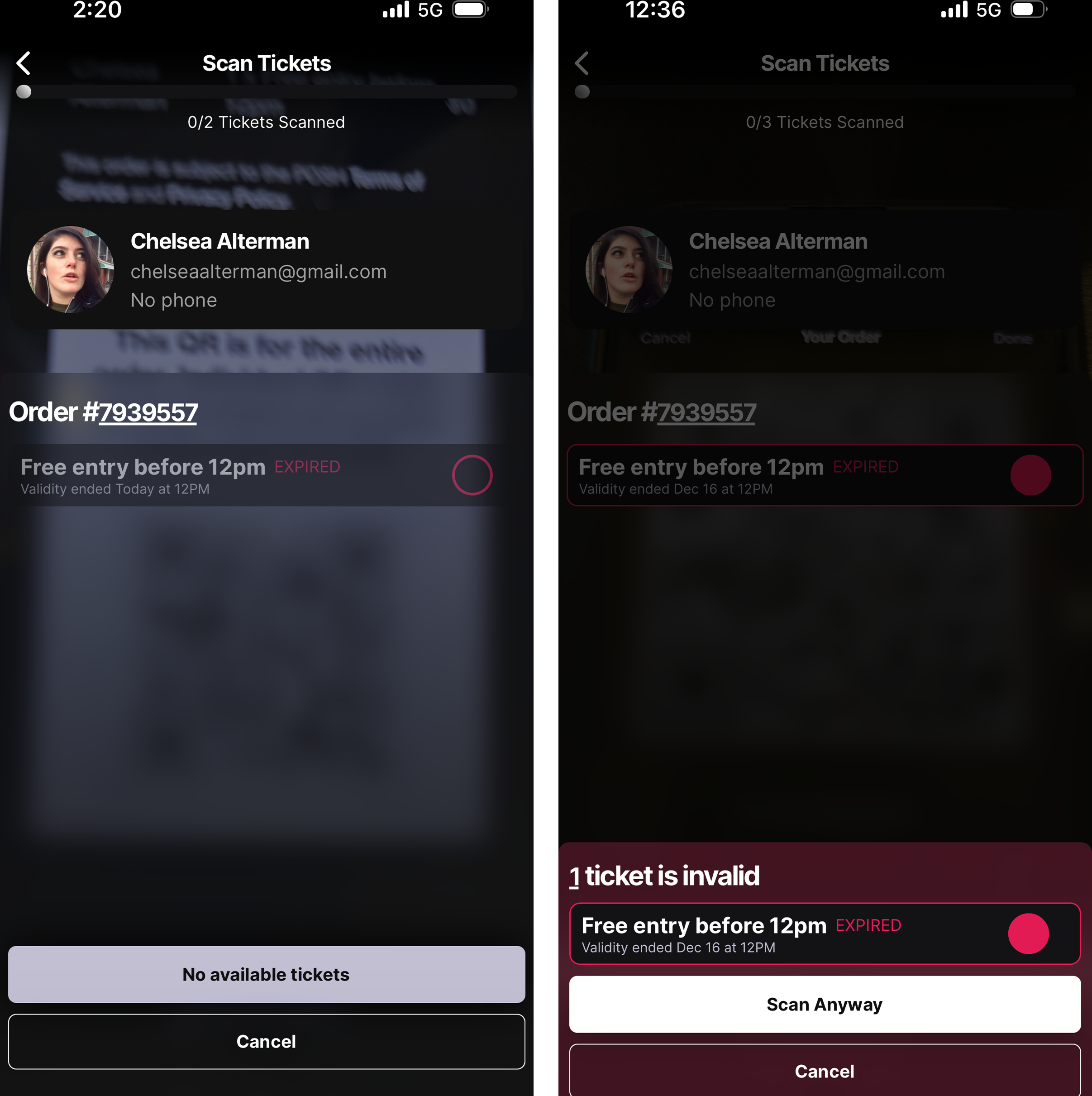 If a ticket scans invalid and turns grey, don’t panic—this just means the ticket isn’t valid yet. Most often, these are time-gated tickets—for example, a free or discounted entry that only activates after a certain time.